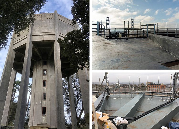 The concrete roof structure is formed in a spoke arrangement, echoing the fin piers. Existing drainage channels were filled with asphalt and the cement forms had been painted at some time in the structure’s history. With layers peeling, it was in need of renovation and waterproofing to ensure the water tower's integrity for years to come.