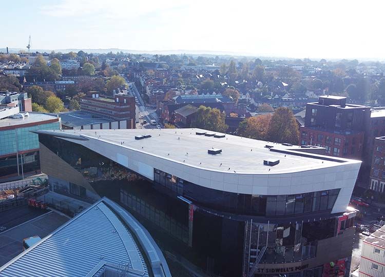 Due to the shape of some of the roofs and tapered scheme with numerous falls, the warm roof insulation thickness varied. For example, the concrete level 3 boomerang shaped roof consisted of a tapered scheme with two falls. Here, a specific outlet location with U-value of 0.16 W/m²K needed to be accommodated. The resulting tapered scheme with sufficient falls for drainage required increased insulation thicknesses, up to 880mm, with the entire roof achieving a U-value of 0.07 W/m²K.